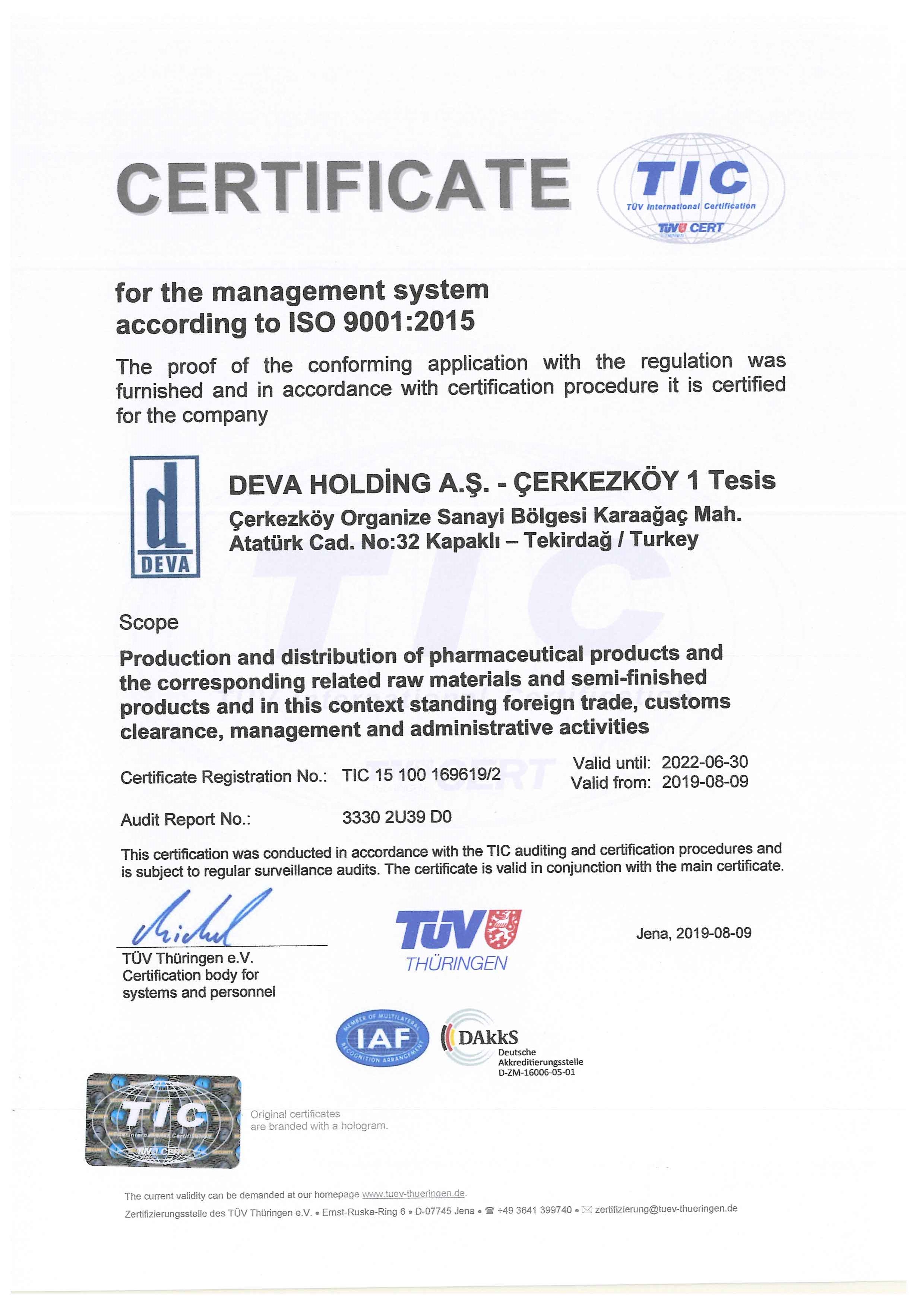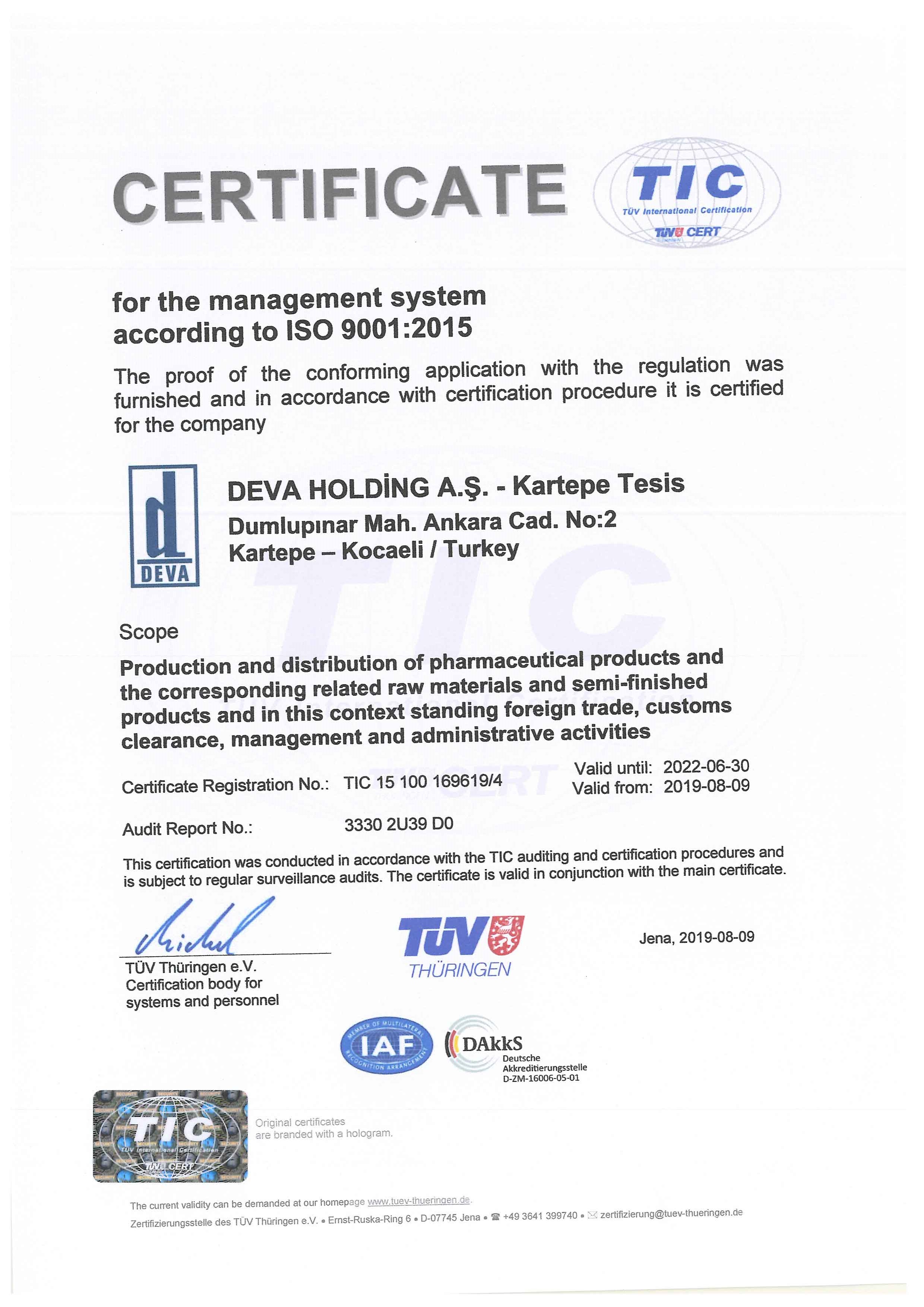 DEVA Holding ISO 9001 Certificate